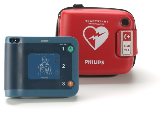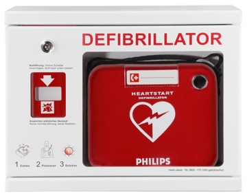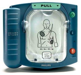 Philips Heartstart Defibrillator is a small, compact device which analyses a person’s heart rhythm and will only defibrillate if necessary.